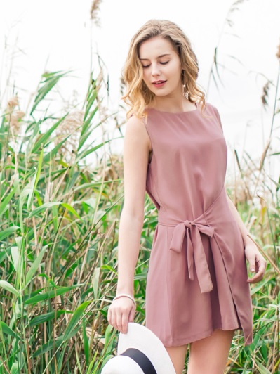 側蝴蝶結綁帶小開衩涼感不易皺無袖洋裝
