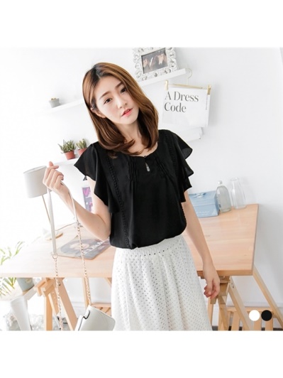 素色抓皺織帶造型圓領傘襬短袖上衣.2色