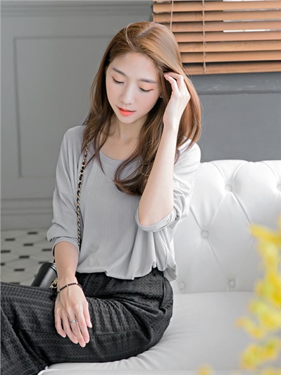 直條細紋垂墜質感圓領落肩寬鬆長袖上衣.3色