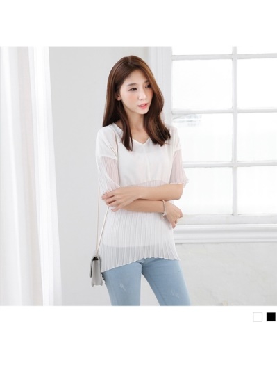 質感拼接微透膚打褶設計前短後長上衣.2色