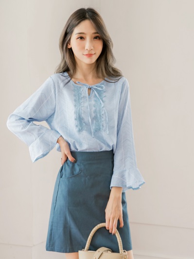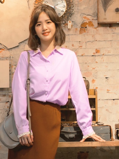 臧芮軒。直條紋拼接鏤空蕾絲珍珠釦襯衫