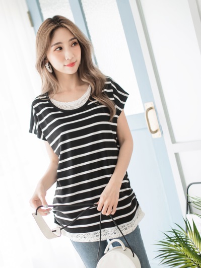 台灣製造.假兩件橫條紋蕾絲蝙蝠袖寬鬆上衣