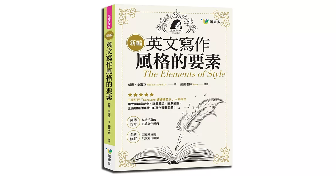 商品描述: 書名:新編英文寫作風格的要素,原文名稱:The Elements of Style,語言:繁體中文,ISBN:9789869627979,頁數:224,出版社:語樂多文化,作者:威廉‧史壯克,譯者:娜娜老師,出版日期:2018/10/03,類別:語言學習