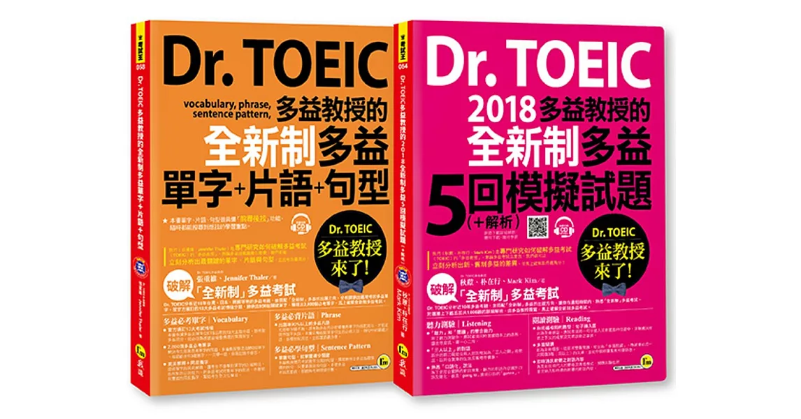 Dr. TOEIC多益教授的全新制多益【單字+片語+句型 / 5回模擬試題】(博客來獨家套書)利用《Dr. TOEIC多益教授的全新制多益單字+片語+句型》學習用外國人的思維背單字,英英解釋才最精確。並整理出必考必備的句型,一邊搭配《Dr. TOEIC多益教授的2018全新制多益5回模擬試題》,完整5回最擬真的模擬試題,掌握實際考試的手感,絕對能夠幫助你戰勝多益考試!