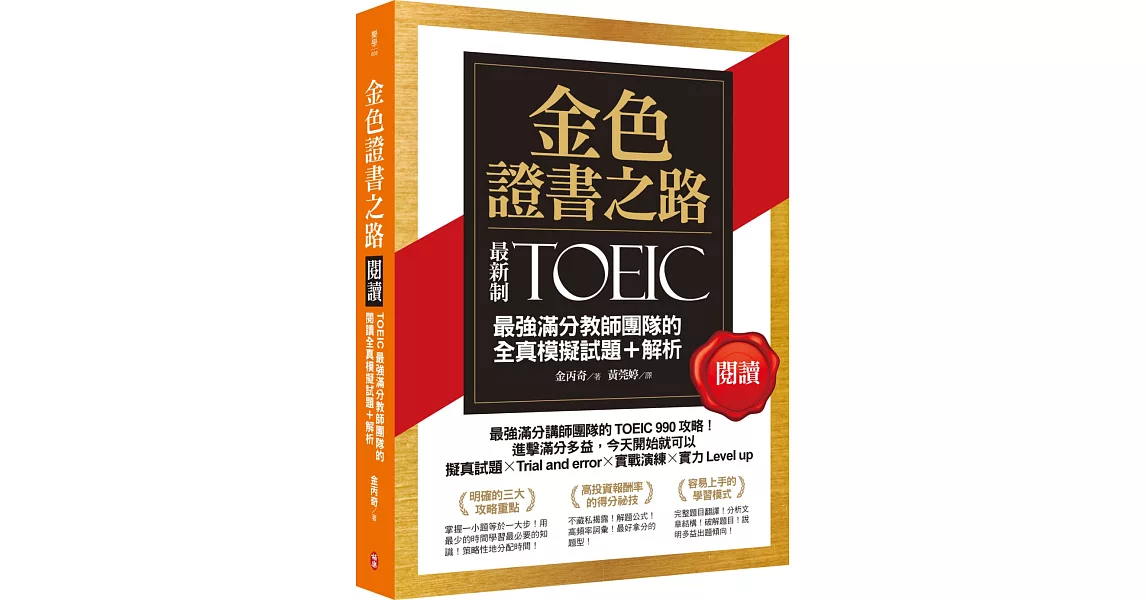 新制多益正式實施後,題型在許多方面做了調整。與此同時,坊間出現了大量對應的教材。然而,這些教材收錄的大多試題都和舊制多益相差無幾。因應如此的情況,TOEIC最強滿分教師金丙奇、白熒植決定推出符合新制多益的教材,完成了《金色證書之路》閱讀及聽力篇。《金色證書之路》針對各題型整理應試技巧。即便讀者認為自己的英文基礎不夠好,也能靠本書傳授的技巧找出正確答案,短時間內快速提升多益分數!