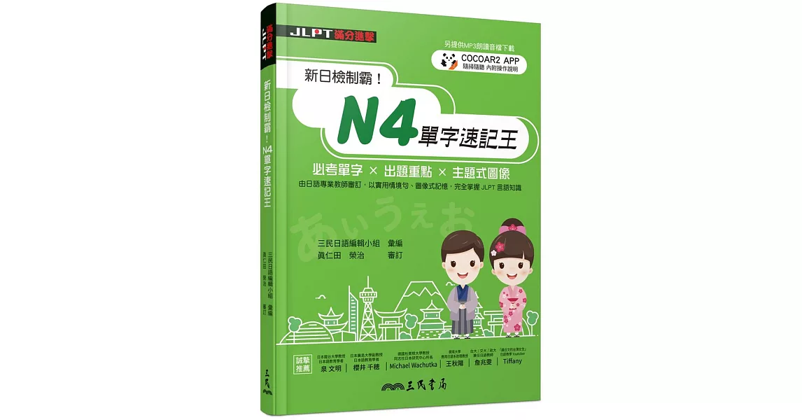 由日籍專業錄音員錄製,能邊聽邊記憶單字,熟悉日語發音同時提升聽力。也可以透過COCOAR2 APP掃描頁面,出門在外輕鬆聆聽音檔。請至https://reurl.cc/xVklN下載,將檔案解壓縮後即可使用,密碼為「本書最後一個單字的編號」(3位數)。