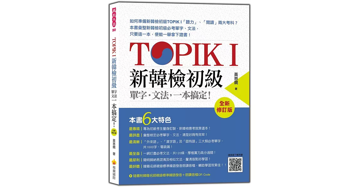 博客來-TOPIK I 新韓檢初級單字‧文法,一本搞定!:全新修訂版(隨書附韓籍名師親錄標準韓語發音+朗讀MP3、音檔QR Code)訂購網址: https://www.books.com.tw/exep/assp.php/87926/products/0010827714?utm_source=87926&utm_medium=ap-books&utm_content=recommend&utm_campaign=ap-201906