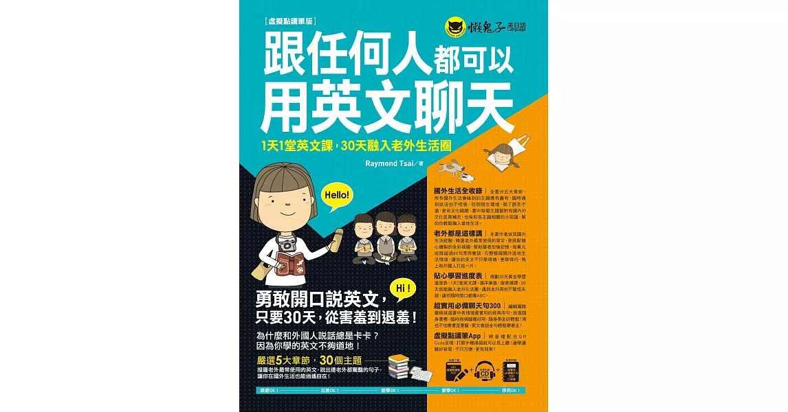 商品描述: 書名:跟任何人都可以用英文聊天:1天1堂英文課,30天融入老外生活圈【虛擬點讀筆版】(附防水書套+超實用必備聊天句300口袋書+1虛擬點讀筆APP+1CD),語言:繁體中文,ISBN:9789864071296,頁數:320,出版社:懶鬼子英日語,作者:Raymond Tsai,出版日期:2019/11/06,類別:語言學習