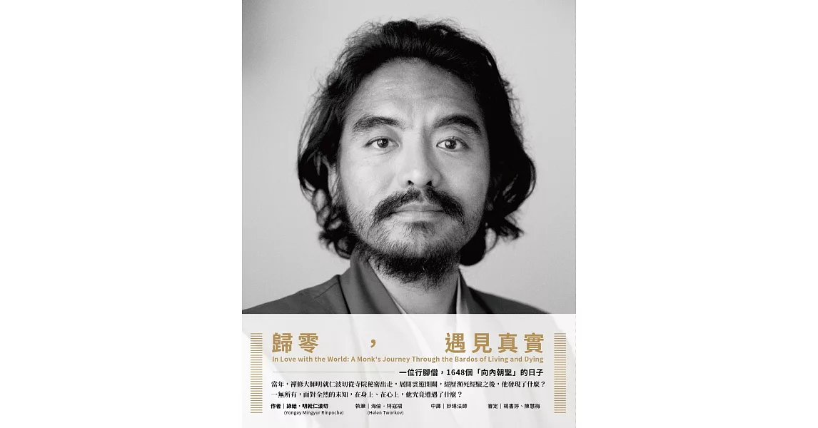 商品描述: 書名:歸零,遇見真實:一位行腳僧,1648個「向內朝聖」的日子,原文名稱:In Love with the World: A Monk’s Journey Through the Bardos of Living and Dying,語言:繁體中文,ISBN:9789869785945,頁數:336,出版社:眾生,作者:詠給・明就仁波切,海倫.特寇福,譯者:妙琳,出版日期:2019/10/04,類別:宗教命理