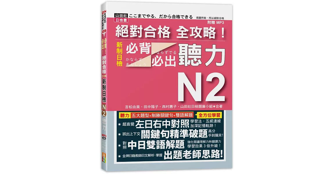 商品描述: 書名:絕對合格 全攻略!新制日檢N2必背必出聽力(18K+MP3),語言:繁體中文,ISBN:9789862465516,頁數:208,出版社:山田社,作者:吉松由美,田中陽子,西村惠子,山田社日檢題庫小組,出版日期:2019/08/05,類別:語言學習
