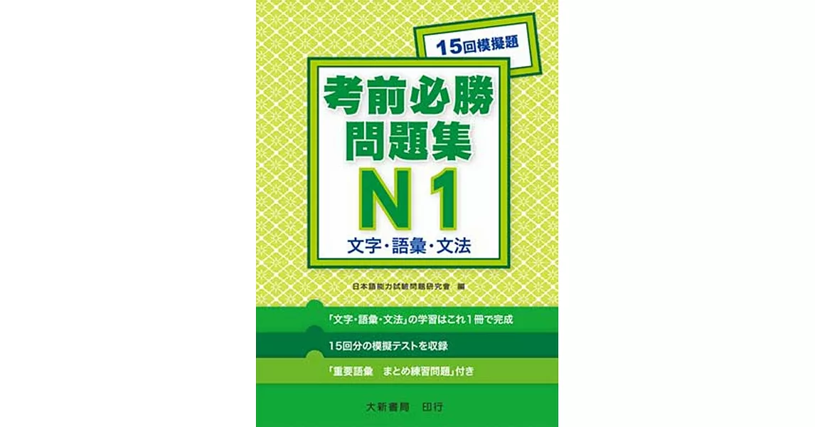 商品描述: 書名:日語檢定 考前必勝問題集 N1 文字・語彙・文法,語言:繁體中文,ISBN:9789866438974,頁數:192,出版社:大新書局,作者:日本語能力試驗問題研究會,國書刊行會編輯部,出版日期:2019/07/01,類別:語言學習