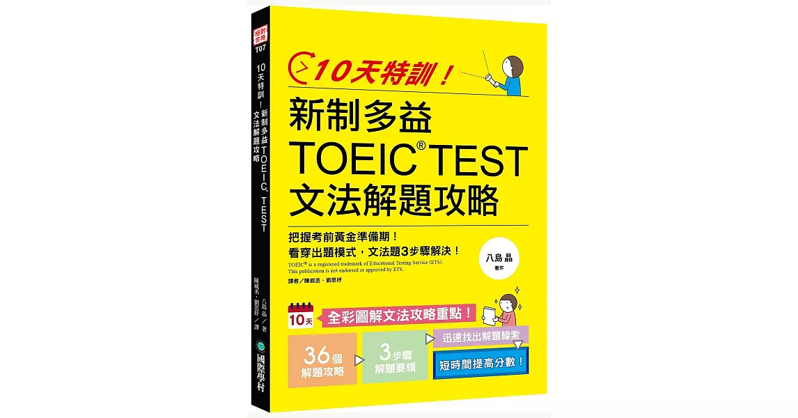 商品描述: 書名:10天特訓!新制多益TOEIC TEST文法解題攻略:把握考前黃金準備期,看穿出題模式,文法題3步驟解決!,原文名稱:出るとこ集中10日間! TOEIC®テスト 文法編,語言:繁體中文,ISBN:9789864541034,頁數:192,出版社:國際學村,作者:八島晶,譯者:陳威丞,劉思妤,出版日期:2019/06/28,類別:語言學習