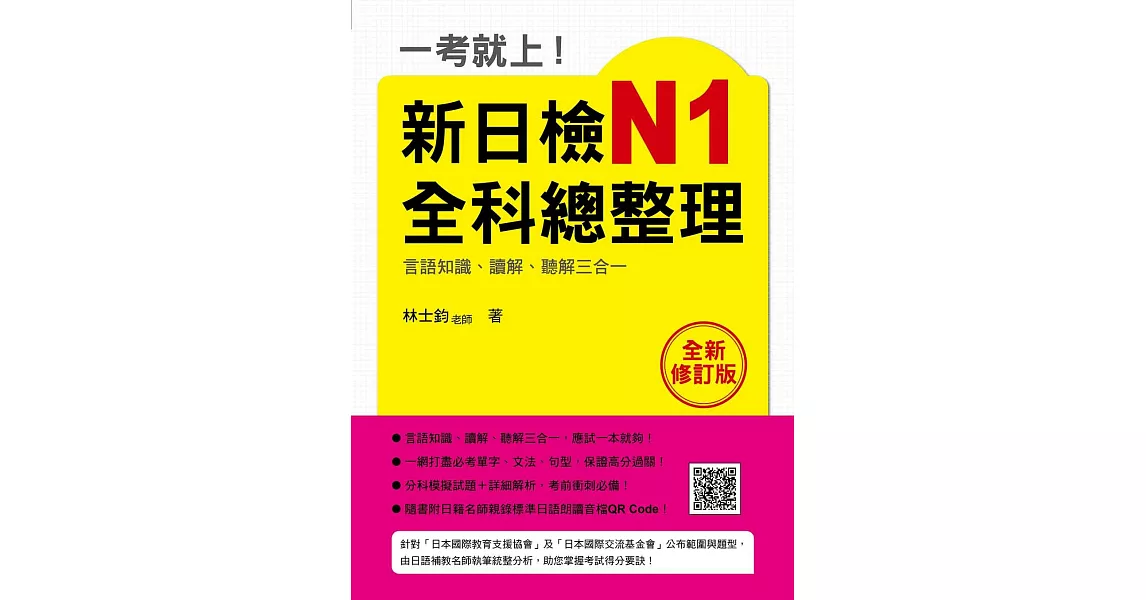 博客來-一考就上!新日檢N1全科總整理全新修訂版(隨書附日籍名師親錄標準日語朗讀音檔QR Code)訂購網址: https://www.books.com.tw/exep/assp.php/87926/products/0010831064?utm_source=87926&utm_medium=ap-books&utm_content=recommend&utm_campaign=ap-201906