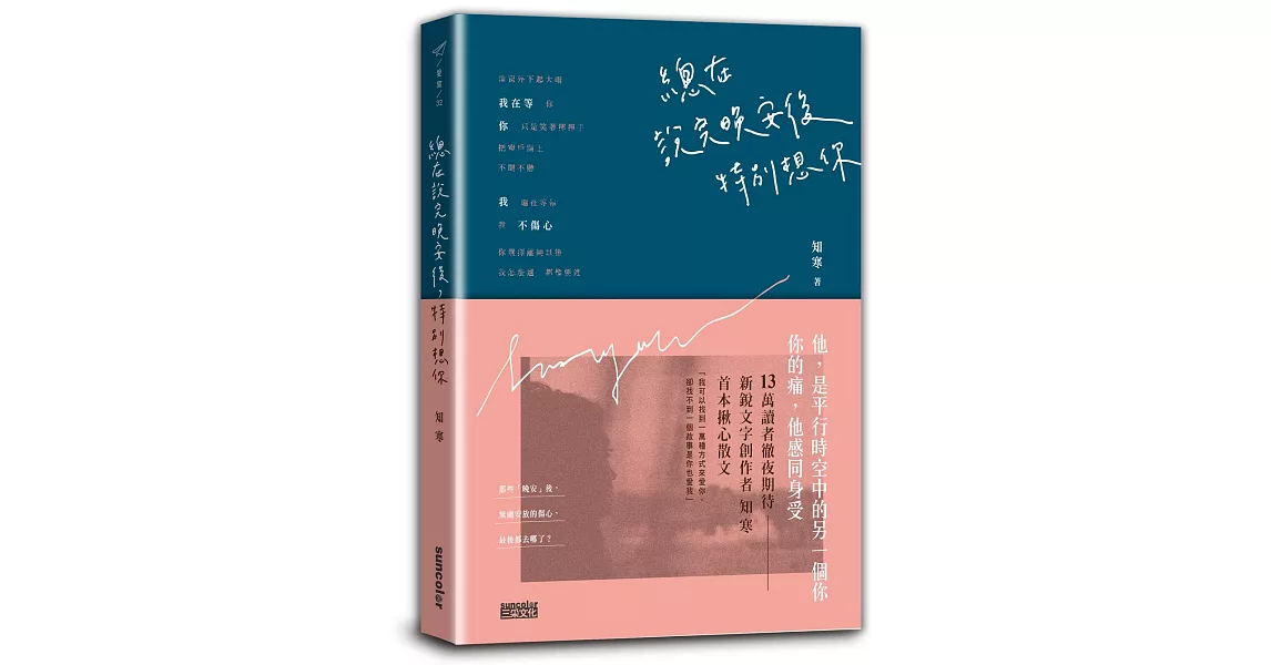 商品描述: 書名:總在說完晚安後,特別想你,語言:繁體中文,ISBN:9789576581892,頁數:280,出版社:三采,作者:知寒,出版日期:2019/06/28,類別:文學小說