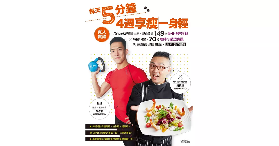 每天5分鐘,4週享瘦一身輕:真人實證,甩肉35公斤專業主廚,親自設計149道低卡快速料理×每招1分鐘,70招隨時可動塑身操=打造纖瘦健康曲線,絕不復胖體質