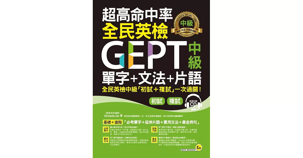 作者國立清華大學講師─Victoria Lin,不只擁有資深名校英語教學經驗、著名英語試卷命題經驗,亦是獲得教育部認可的命題大師,多年來致力研究英檢考題,為考生打造完全符合考題趨勢的黃金例句!