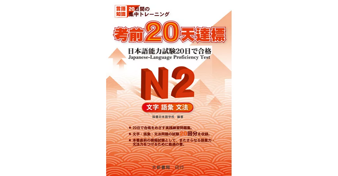 商品描述: 書名:考前20天達標 N2 文字.語彙.文法,原文名稱:日本語能力試験 20日で合格 N2文字、語彙、文法,語言:繁體中文,ISBN:9789866132407,頁數:176,出版社:大新書局,作者:国書日本語学校,本地裕彦,出版日期:2020/05/01,類別:語言學習