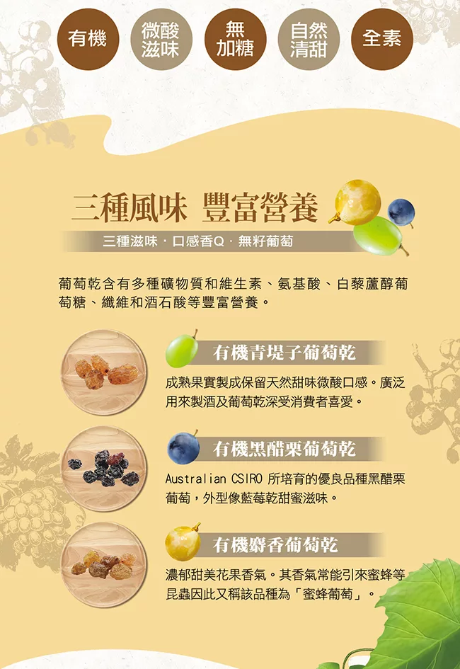 →→→→更多詳細”《紅布朗》澳洲有機日曬葡萄乾(300g/罐)”介紹請點我