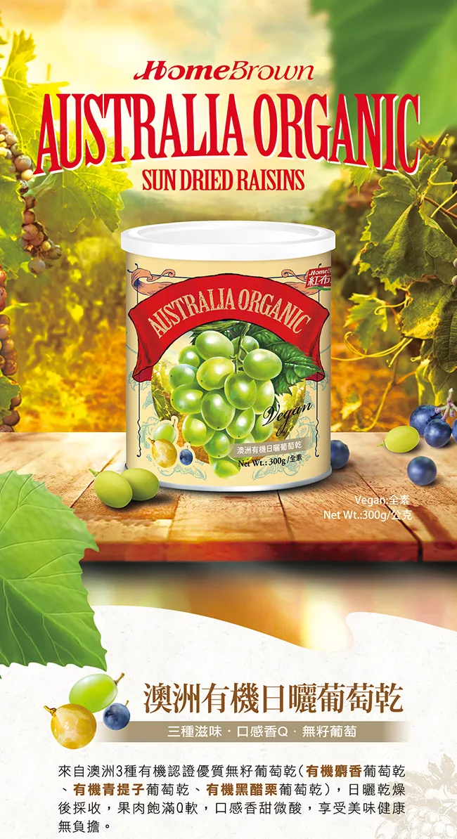 商品說明: 《紅布朗》澳洲有機日曬葡萄乾(300g/罐)
