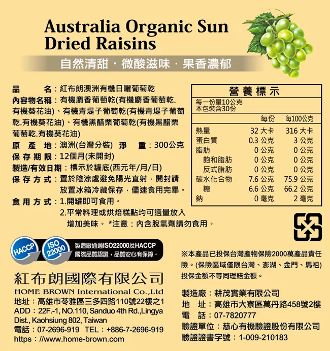 商品描述: 《紅布朗》澳洲有機日曬葡萄乾(300g/罐)