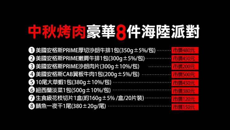 →→→→更多詳細”【優鮮配】中秋烤肉豪華8件海陸派對(約4-6人份/約2.6kg)免運組無下單5個工作天到貨”介紹請點我