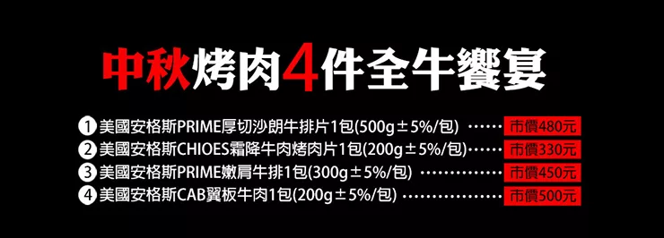 →→→→更多詳細”【優鮮配】中秋烤肉全牛饗宴(厚切沙朗+霜降牛+嫩肩牛+翼板牛)免運組無下單5個工作天到貨”介紹請點我