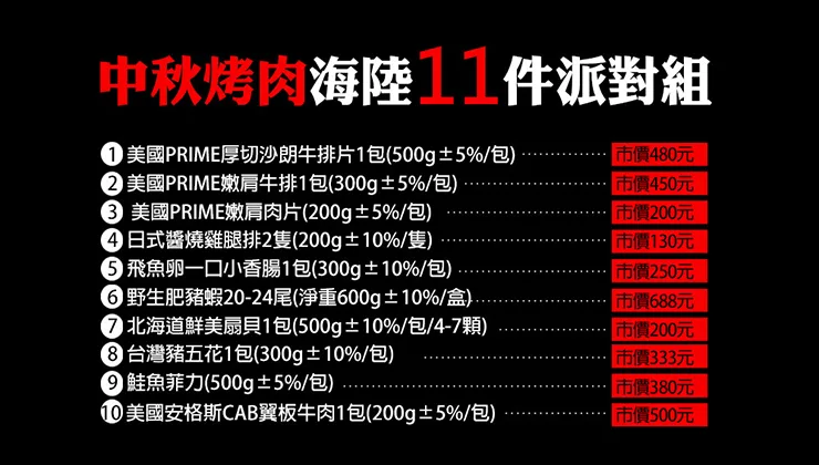 →→→→更多詳細”【優鮮配】中秋烤肉海陸11件派對(約6-10人份/約3.6kg)免運組無下單5個工作天到貨”介紹請點我