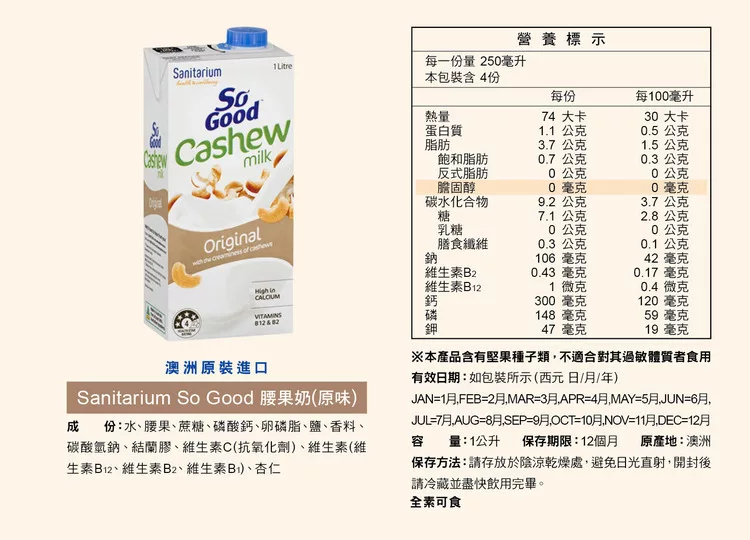 博客來-[澳洲 SO GOOD] 原味腰果奶 (1L) (全素)訂購網址: https://www.books.com.tw/exep/assp.php/87926/products/N001248555?utm_source=87926&utm_medium=ap-books&utm_content=recommend&utm_campaign=ap-202002