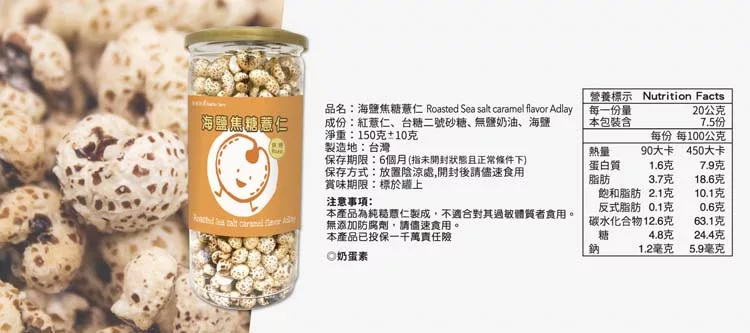 商品說明: 【品益生技】低溫烘焙-甜心爆紅薏仁混搭組-海鹽焦糖150g*1+鹽烤腰果200g*2