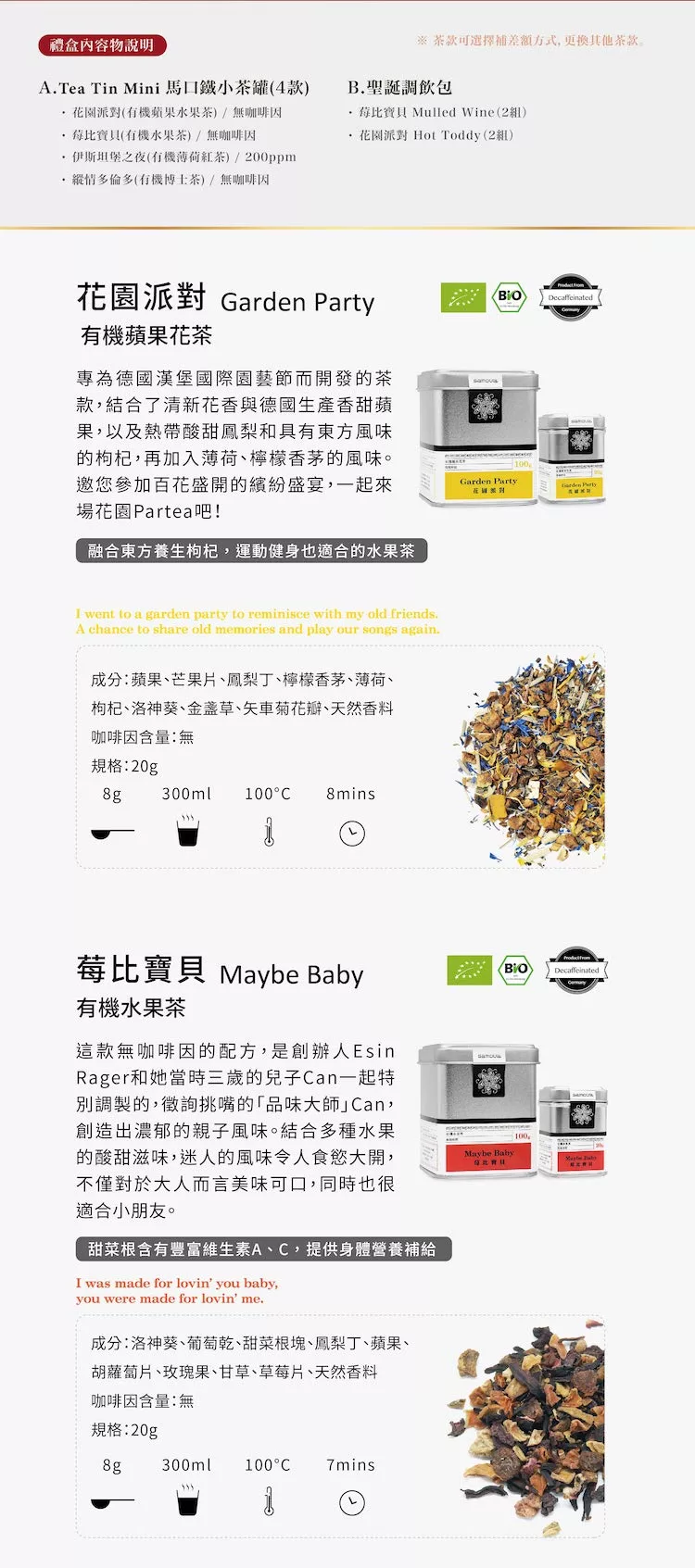 商品描述: 【samova 歐洲時尚茶飲】派對人氣創新調飲禮:產品內容物與規格說明/保固資訊:內容物品名:GardenParty花園派對(有機蘋果花茶)-蘋果,芒果片,鳳梨丁,檸檬香茅,薄荷,枸杞,洛神葵,金盞草,矢車菊花瓣,天然香料品名:MaybeBaby莓比寶貝(有機水果茶)-有機水果茶成分:有機洛神葵,有機葡萄乾,有機甜菜根,有機鳳梨丁,有機蘋果,有機胡蘿蔔片,有機玫瑰果,有機甘草,有機草莓片,天然香料……