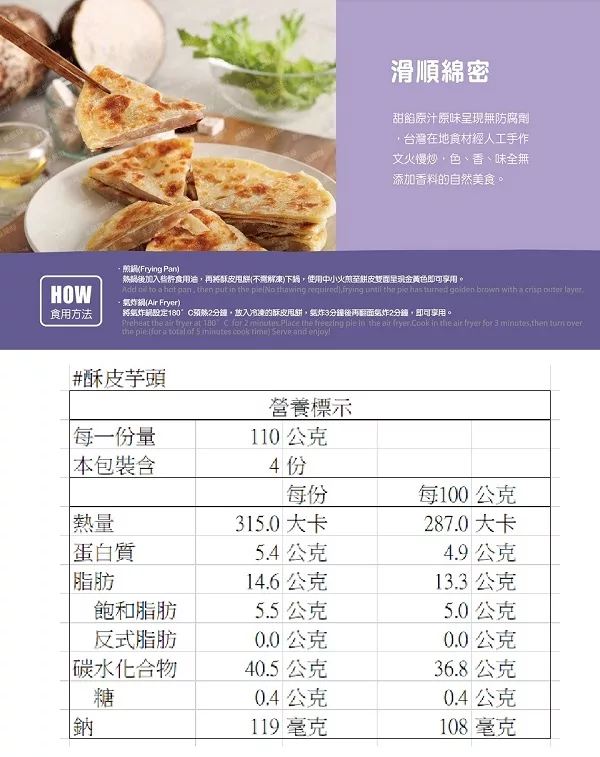 商品描述: 嚴選台灣在地大甲「檳榔心芋頭」入餡滑順綿密、細而不膩,再配上經64道手工製成的酥脆外皮,相互呼應的絕妙組合,絕對值得一嚐。芋頭小知識:芋頭的營養價值高,不僅富含澱粉及膳食纖維,較易有飽足感,還能促進腸道蠕動、助消化。與許多蔬菜的纖維含量相當,因此也有「澱枌類的蔬菜」之稱。產品內容物與規格說明/保固資訊:商品規格品名:派脆刻-酥皮芋頭甩餅(4片/包,共3包)成分:粉心麵粉、水、芋頭、精製植物油(棕櫚……