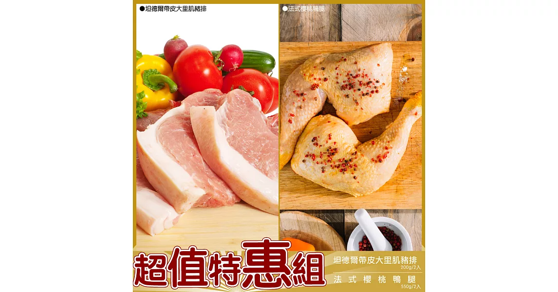 商品說明: 【海大王】特惠組(坦德爾帶皮大里肌豬排200g*2+法式櫻桃鴨腿550g*2)
