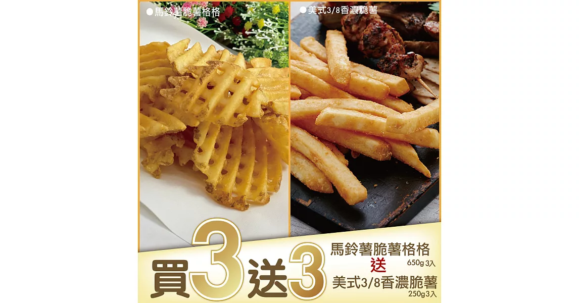 商品描述: 【海大王買三送三】即期-馬鈴薯酥脆薯格格650g*3入組(送美式3/8香濃脆薯250g*3)