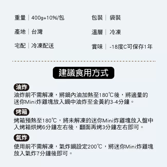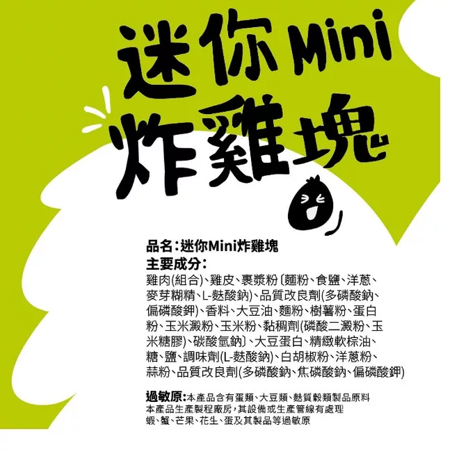 商品描述: 《黑貓探險隊 跨店任選專區》【綠野農莊】迷你MINI炸雞塊(400g/包)(恕不指定到貨日)