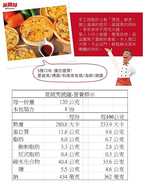 商品描述: 銅板美食,抗漲首選厚底手工餅皮醬料親手拿捏製作一人獨享剛剛好,大口享受超美味的5吋披薩!五種口味瘋狂好吃(夏威夷/總匯/海鮮/燻雞/和風章魚燒)產品內容物與規格說明/保固資訊:商品規格品名:《派脆刻》厚片5吋夏威夷PIZZA(6片/包,共3包)成分:餅皮(麵粉、大豆沙拉油、糖、鹽、酵母)、乳酪絲(乾酪、棕櫚油、酪蛋白、粘稠劑(醋酸澱粉、鹿角菜膠)、調味劑(氯化鉀)、鹽、調味劑(檸檬酸鈉)、品質改良……