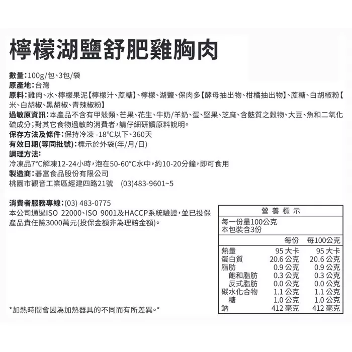 商品描述: 【KKLife】檸檬湖鹽舒肥雞胸肉(100g/包;3包/袋)  減脂增肌好幫手!新品上市! 雞胸肉質水嫩無人工添加物風味淡雅清爽解凍即食  KKLife檸檬湖鹽舒肥雞胸肉水嫩,多汁不柴,天然調味無添加,享受美食安心吃,輕食熟食便利食用,無需調理,退冰即可食舒肥技術,將雞胸以恆定低溫隔水均勻受熱保存其水分與養分,讓雞肉更鮮嫩甜美 隨手包,一點餓即可滿足配合運動,輕鬆補充優質蛋白質,讓飲食更輕鬆簡單 ……