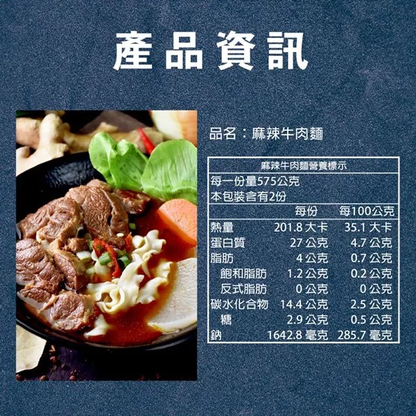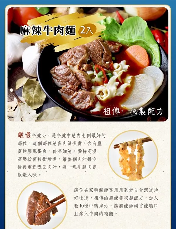 商品描述: 麻辣牛肉麵:嚴選牛腱心,是牛腱中筋肉比例最好的部位,這個部位筋多肉質硬實,含有豐富的膠原蛋白,佈滿細筋,獨特高溫高壓殺菌技術燉煮,讓整個肉汁排空後再重新吸回肉汁,每一塊牛腱肉皆軟嫩入味,讓你在家輕鬆能享用用到源自台灣道地好味道,祖傳的麻辣醬秘製配方,加入數10種中藥拌炒,讓麻辣湯頭香辣順口且溶入牛肉的精髓。建議食用方式:1.取出麵體放入滾水中,稍微攪拌麵體使其鬆散並均勻受熱,約煮6分鐘依個人口感喜……