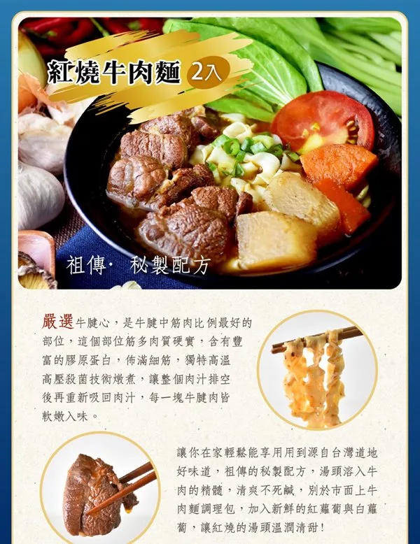 商品描述: 來自台灣的道地美味祖傳秘製熬煮配方選用百年傳統手工日曬關廟麵紅燒牛肉麵:嚴選牛腱心,是牛腱中筋肉比例最好的部位,這個部位筋多肉質硬實,含有豐富的膠原蛋白,佈滿細筋,獨特高溫高壓殺菌技術燉煮,讓整個肉汁排空後再重新吸回肉汁,每一塊牛腱肉皆軟嫩入味,讓你在家輕鬆能享用用到源自台灣道地好味道,祖傳的秘製配方,湯頭溶入牛肉的精髓,清爽不死鹹,別於市面上牛肉麵調理包,加入新鮮的紅蘿蔔與白蘿蔔,讓紅燒的湯頭溫……