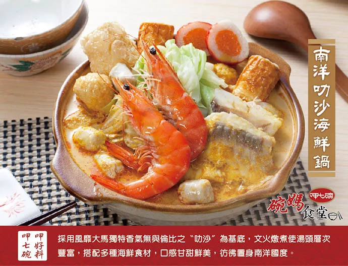 商品描述: 商品介紹:商品覆熱方式說明:產品內容物與規格說明/保固資訊:1.商品組合/規格:【呷七碗】南洋叻沙海鮮鍋2.商品品名:【呷七碗】南洋叻沙海鮮鍋3.商品重(容)量:840公克/件4.內容物名稱(成分):水.叻沙醬(辣椒.蔥頭.棕櫚食用植物油.南薑.蝦米.食鹽.糖.蒜頭.天然香料). 蠔油(水.糖.鹽.蠔汁.調味劑(L-麩酸鈉).粘稠劑(羥丙基磷酸二澱粉).小麥粉. 焦糖色素)).醬油.高麗菜.豆……