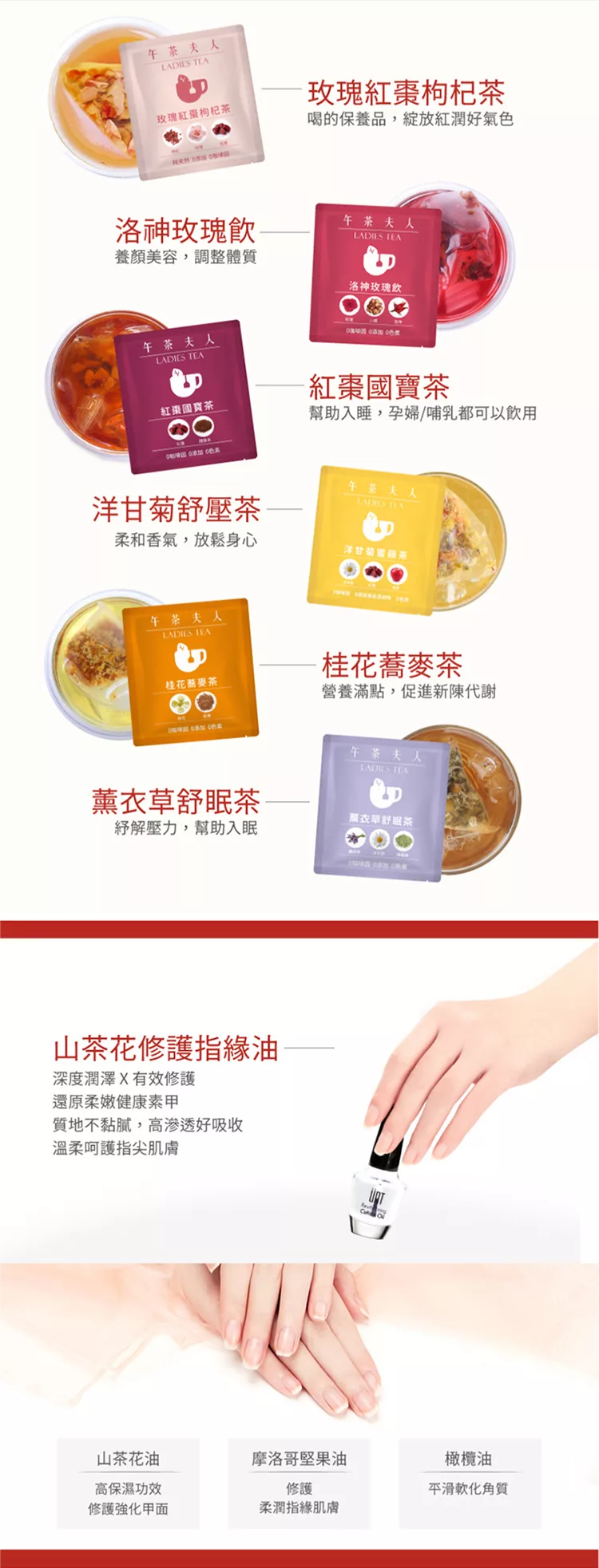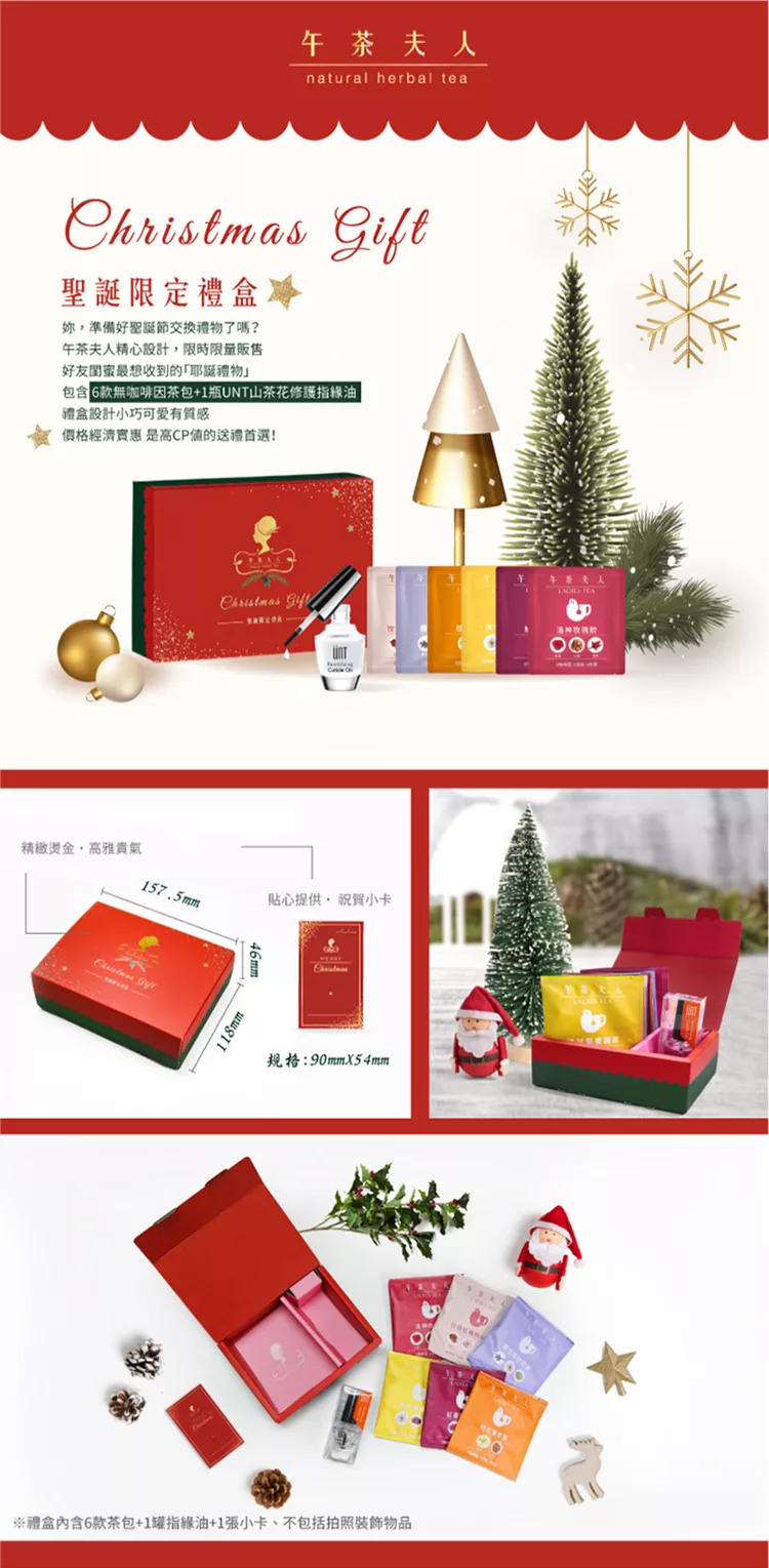 商品描述: 商品介紹:午茶夫人精心設計,限時限量販售好友閨蜜最想收到的「耶誕禮物」提供祝賀小卡,把你想說的心裡話,隨著禮盒一起送給對方吧!禮盒內容物包括:玫瑰紅棗枸杞茶、洛神玫瑰飲、紅棗國寶茶、薰衣草舒眠茶、桂花蕎麥茶、洋甘菊蜜蘋茶各1入,共計6入茶包及UNT山茶花修護指緣油1瓶,並貼心附贈一張祝賀小卡★聖誕節交換禮物必選★聯手UNT為您打造從裡到外的美麗★精選無咖啡因茶款搭配應景的盒身設計內容豐富外觀精緻產……